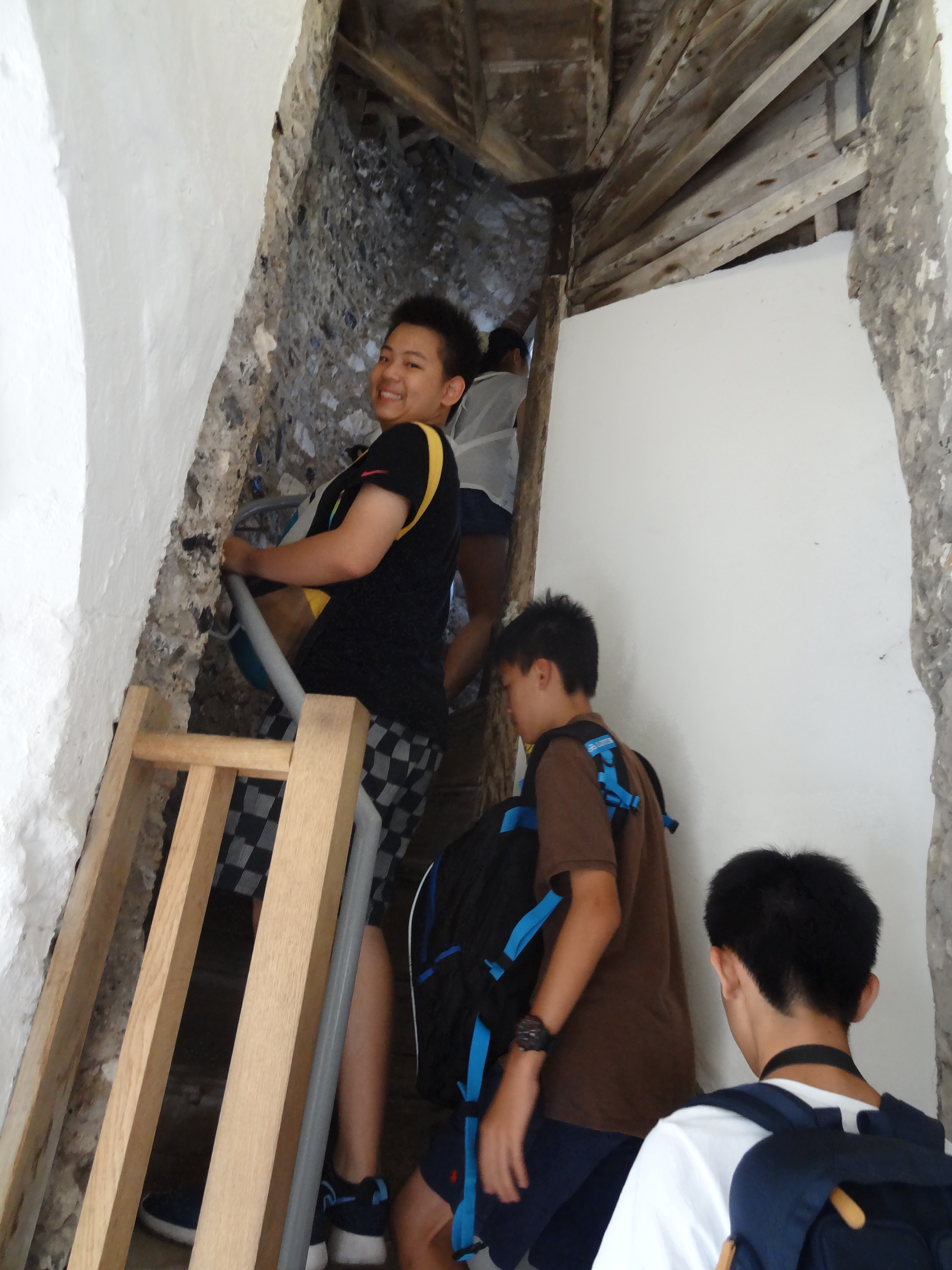 我們沿著路走進城堡裡面,順著360度的狹小樓梯往上爬,終於來到古堡頂端。從同學認真拍照的表情,就可以知道古堡外的景色有多迷人,更想知道在這麼古老的城堡中,曾經發生哪些事,回去一定要認真查一查。